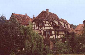 La Décapole était, à lépoque médiévale, un groupement de ville qui comprenait Haguenau, Colmar, Mulhouse, Munster, Turckheim, Kaysersberg, Obernai, Sélestat, Rosheim et, bien entendu, Wissembourg. La Décapole, créée par Charles IV en 1354, disparut avec la Révolution Française. Cest en 1648 quelle rejoignit le Royaume de France, après le Traité de Westphalie. Stanislas Leszczynsky, roi détrôné de Pologne, sexilera un moment dans la cité. Son hôtel, ancien collège est aujourdhui une maison de repos. Le roi Stanislas laissera beaucoup de traces à Wissembourg et cest sa fille, Marie Leszczynska, que Louis XV épousera. Au XIIIème siècle, Wissembourg fut le théâtre dun historique conte de fées, que je vous raconte ici... Les fortifications médiévales furent consolidés en 1746. Ces fortifications étaient également protégées par quatre châteaux, dont il ne reste plus aujourdhui, quune tour isolée. Wissembourg paya très cher pendant les guerres qui suivirent la Révolution Française de 1789 et au cours de la guerre de 1870, qui fut particulièrement désastreuse pour le nord de lAlsace. Cette ville, pleine de rêves et de fantaisies, fut le berceau de "lAmi Fritz" dErckmann-Chatrian. Je ne pourrais terminer sans citer ce que me disait, hier encore, Hansi : "Je ne puis me promener dans les rues de Wissembourg, sans rencontrer les amis de Fritz Kobus, sans évoquer à chaque pas une scène, un décor du célèbre roman. Voici sur le quai lancienne belle maison où les Kobus habitent depuis des générations ; voici Katel, la vieille cuisinière revenant du marché ; voici Fritz Kobus lui même traversant la place pour aller à la brasserie où déjà lattendent le grand Frédéric Schultz et le percepteur Hahn ; voici enfin dans cette étroite ruelle, courbé, appuyé sur sa canne, David Sichel, le chef couvert de son antique haut-de-forme. Et dans ce pays riant de prés et de forêts, on nira pas loin sans trouver la ferme de Meisenthal où habitent Suzel et le père Christel et lon a le choix parmi les villages des environs pour situer la fête pendant laquelle Kobus invita Suzel à danser la valse dhonneur..." |